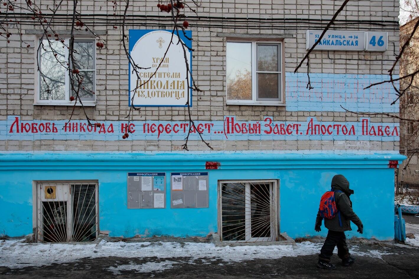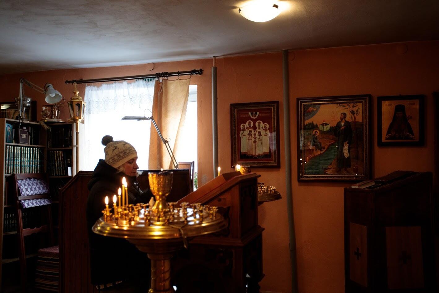 Выглядит храм нетипично: вместо золотых куполов металлическая дверь в подвал, окрашенная в синий цвет и никаких заборов вокруг.