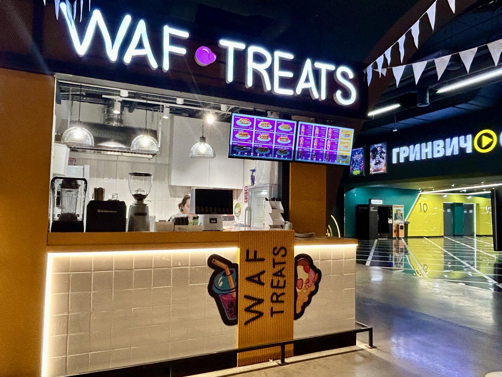 По соседству с Kosmos Donuts расположилась точка Waf Treats, где продают гонконгские вафли. Вафли со сладкими и сытными начинками в среднем стоят 339–399 рублей. Например, здесь можно купить вафлю с бананом и пеканом за 349 рублей или вафлю «Цезарь» с курицей и зеленью за 339 рублей.