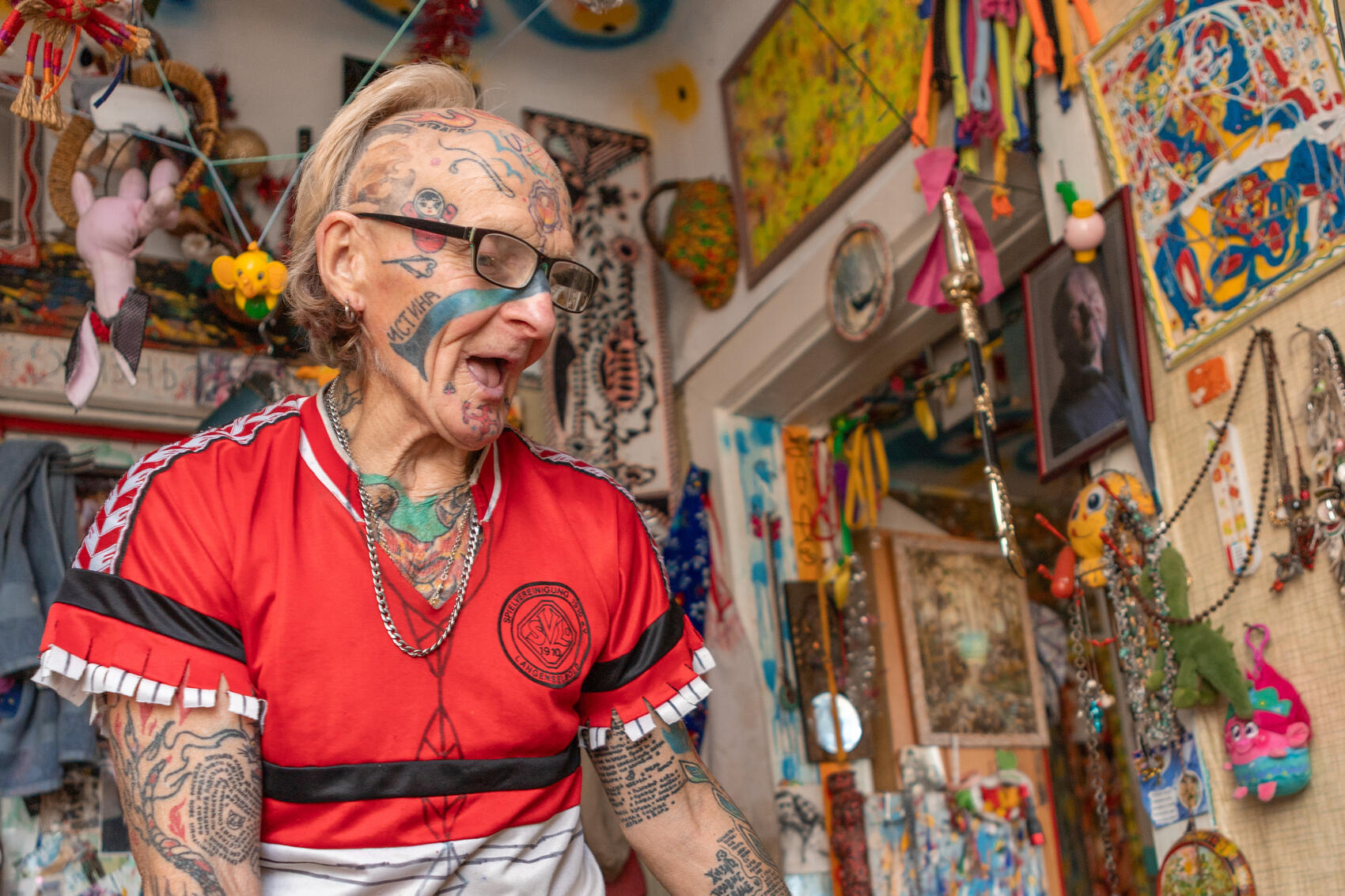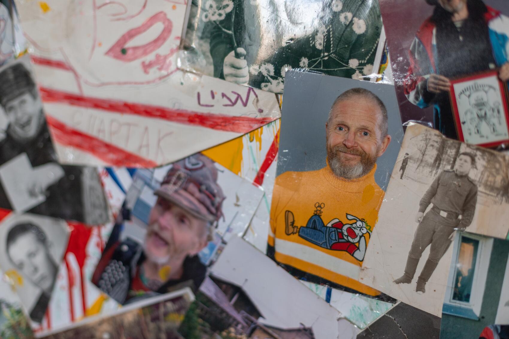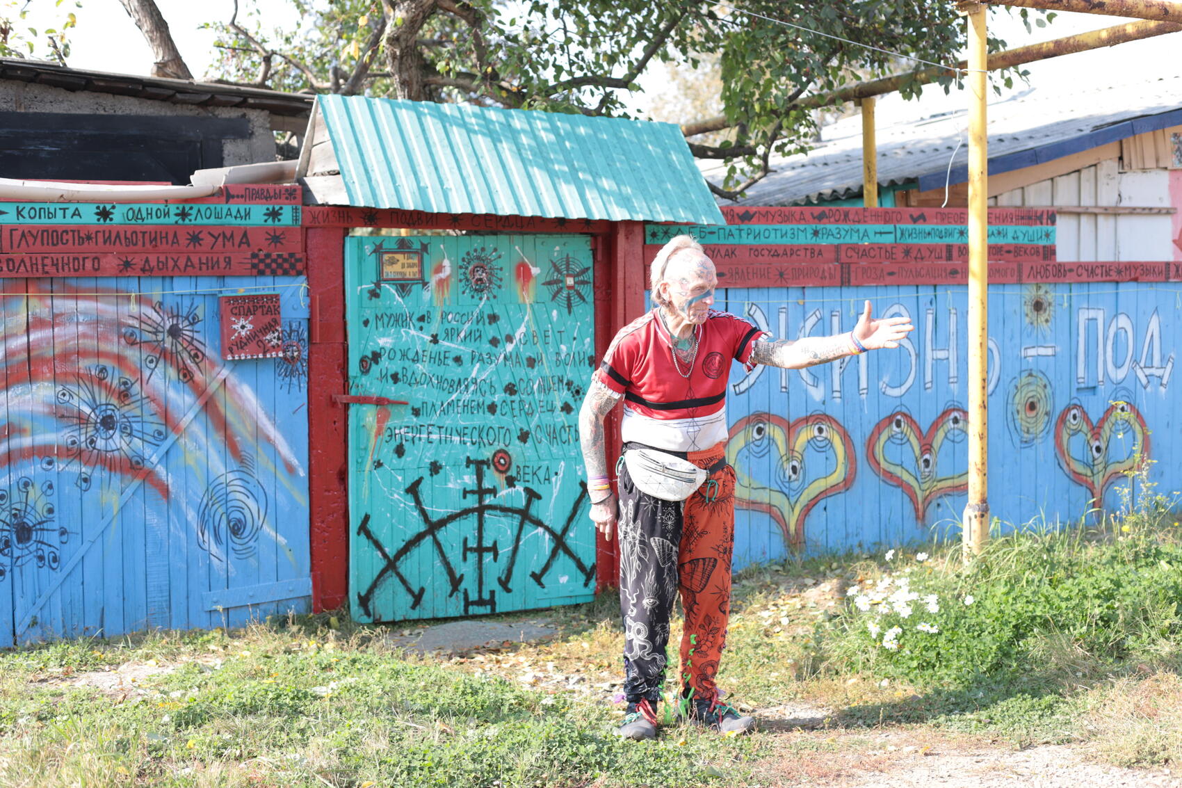 Из разукрашенной избушки к нам выходит такой же разукрашенный мужчина. Все его тело в татуировках, светло-голубые глаза бегают туда-сюда, ни на чем не фокусируясь, такая же расфокусированная и его речь. Спартаку за семьдесят, у него совсем нет зубов, он одет в пеструю одежду, шнурки кроссовок украшают разноцветные веревочки, а на пальце у него стеклянный перстень, имитирующий глазное яблоко.