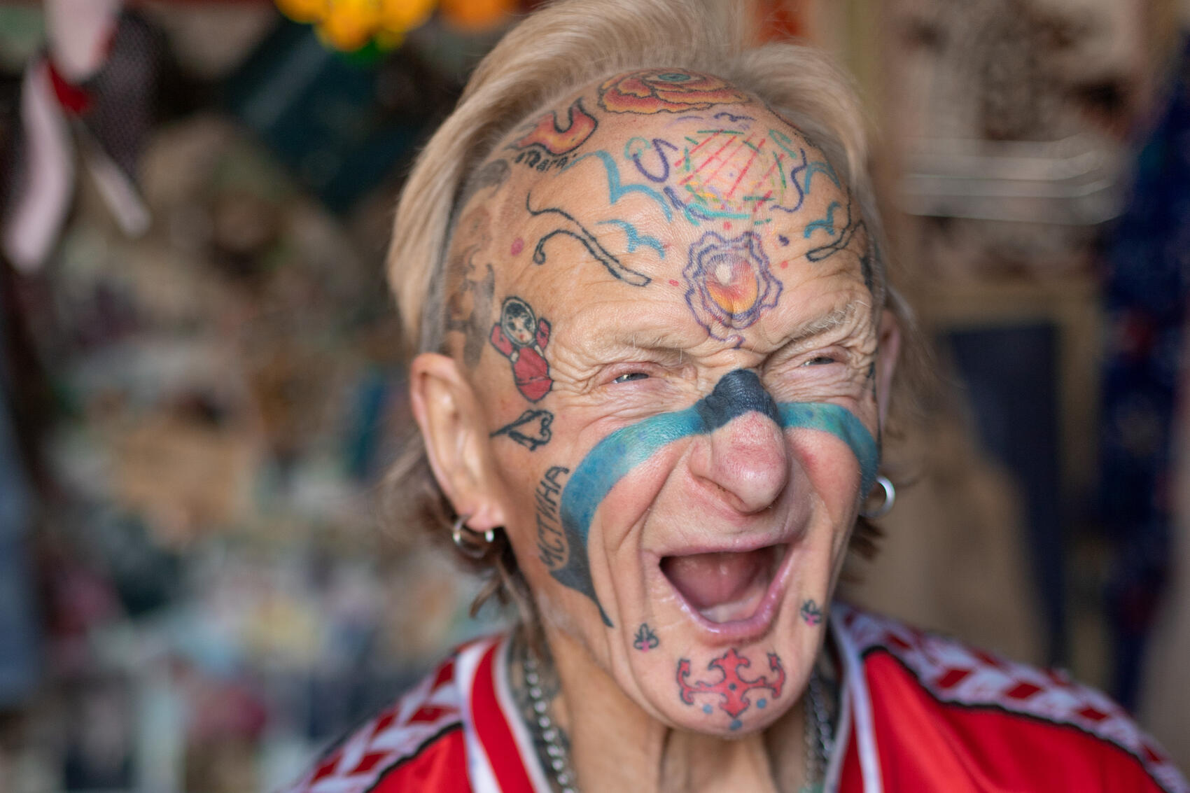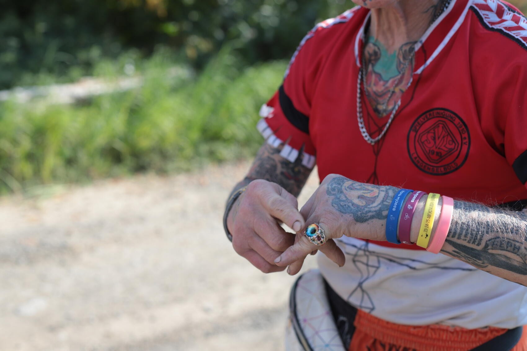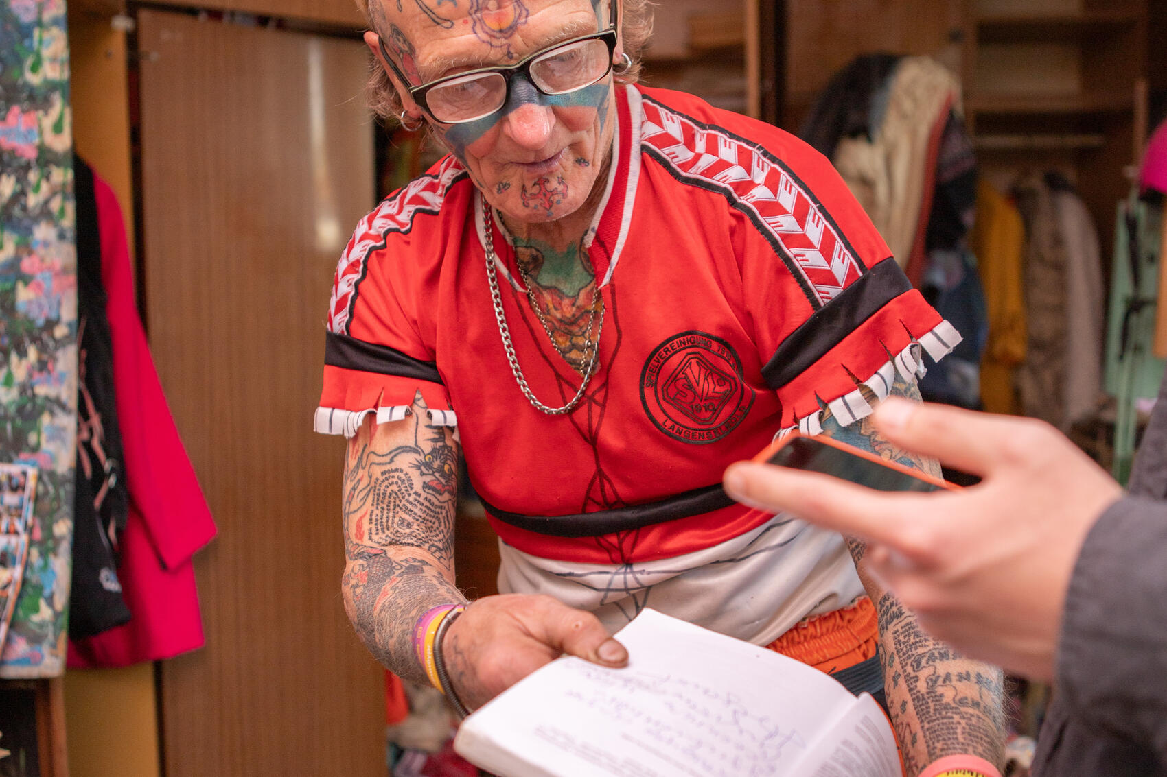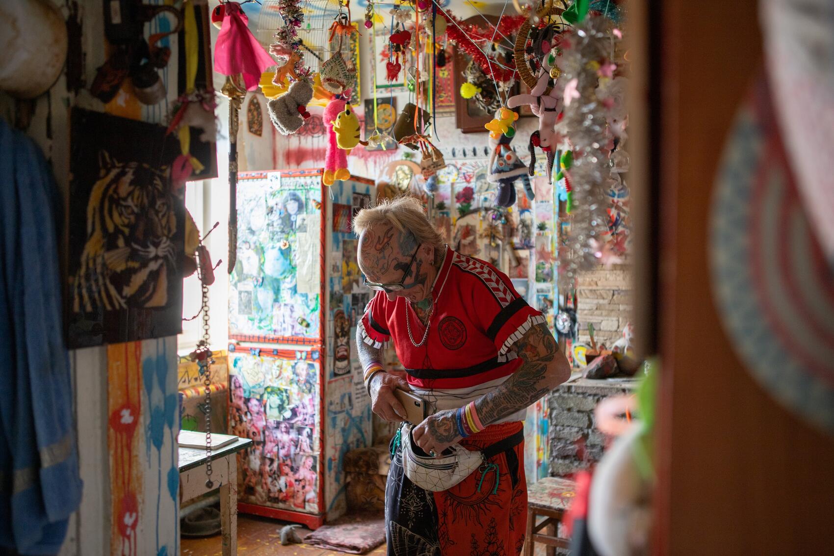 Из разукрашенной избушки к нам выходит такой же разукрашенный мужчина. Все его тело в татуировках, светло-голубые глаза бегают туда-сюда, ни на чем не фокусируясь, такая же расфокусированная и его речь. Спартаку за семьдесят, у него совсем нет зубов, он одет в пеструю одежду, шнурки кроссовок украшают разноцветные веревочки, а на пальце у него стеклянный перстень, имитирующий глазное яблоко.