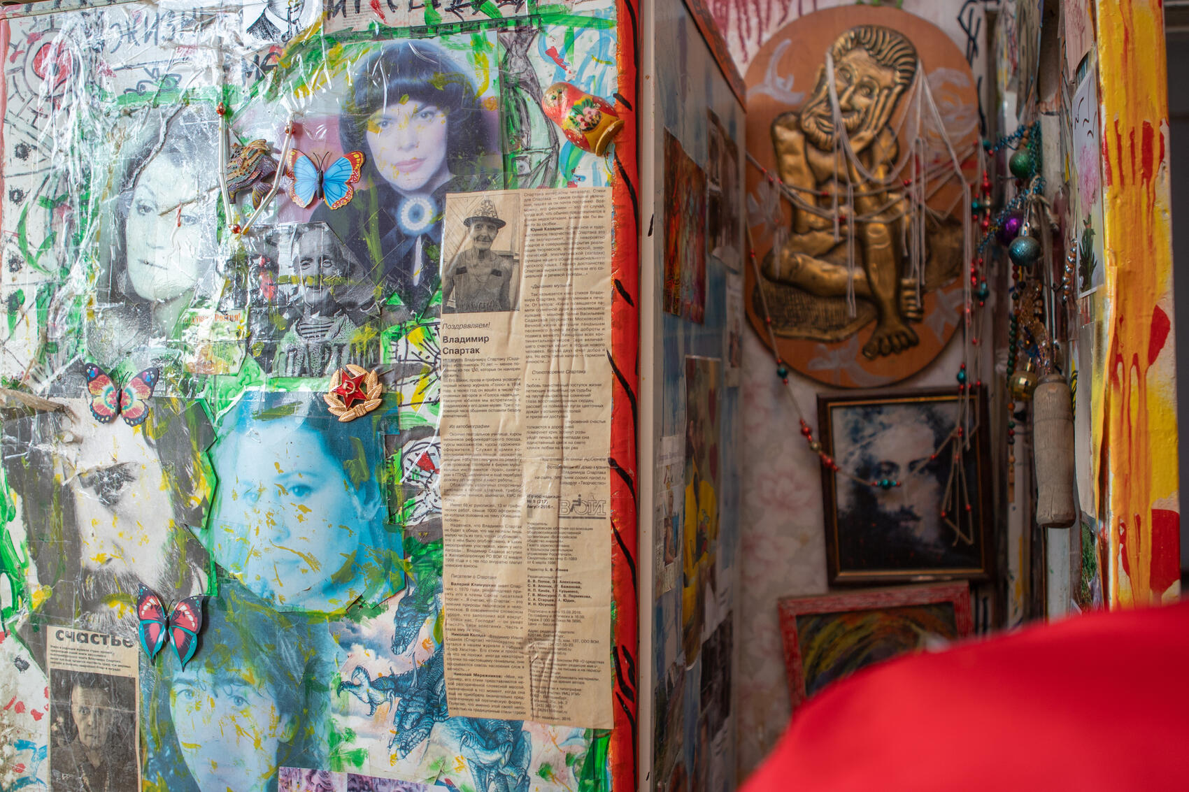 Мы попадаем в дом, стены которого оклеены фотографиями художника в молодости, ретропостерами с голыми женщинами и вырезками из газет, в которых репортеры рассказывали про эксцентричного художника.