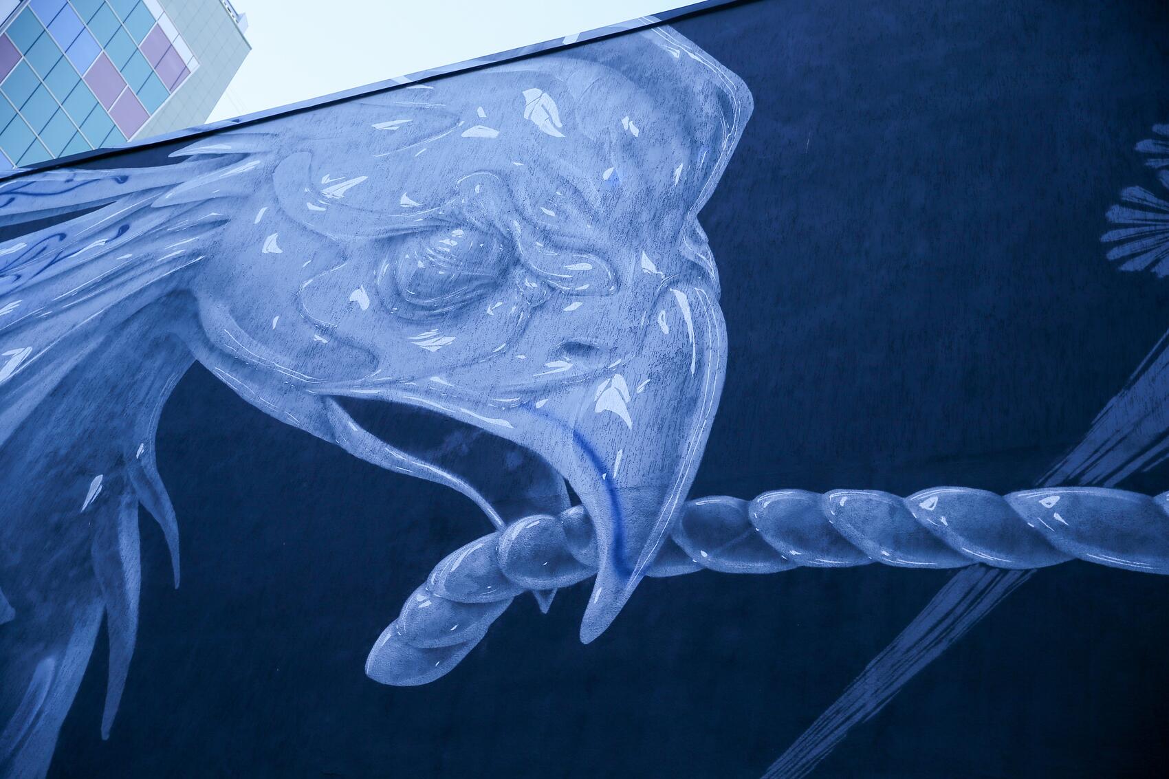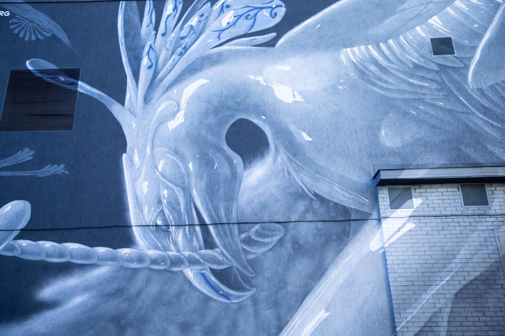 Nut трудился над работой две недели, у него было всего два помощника, а сам он рисовал без помощи проектора. Птицы на его мурале будто бы сделаны из фарфора. Чтобы получить такой необычный эффект блестящего фарфора, организаторам пришлось найти очень много разных оттенков серого.