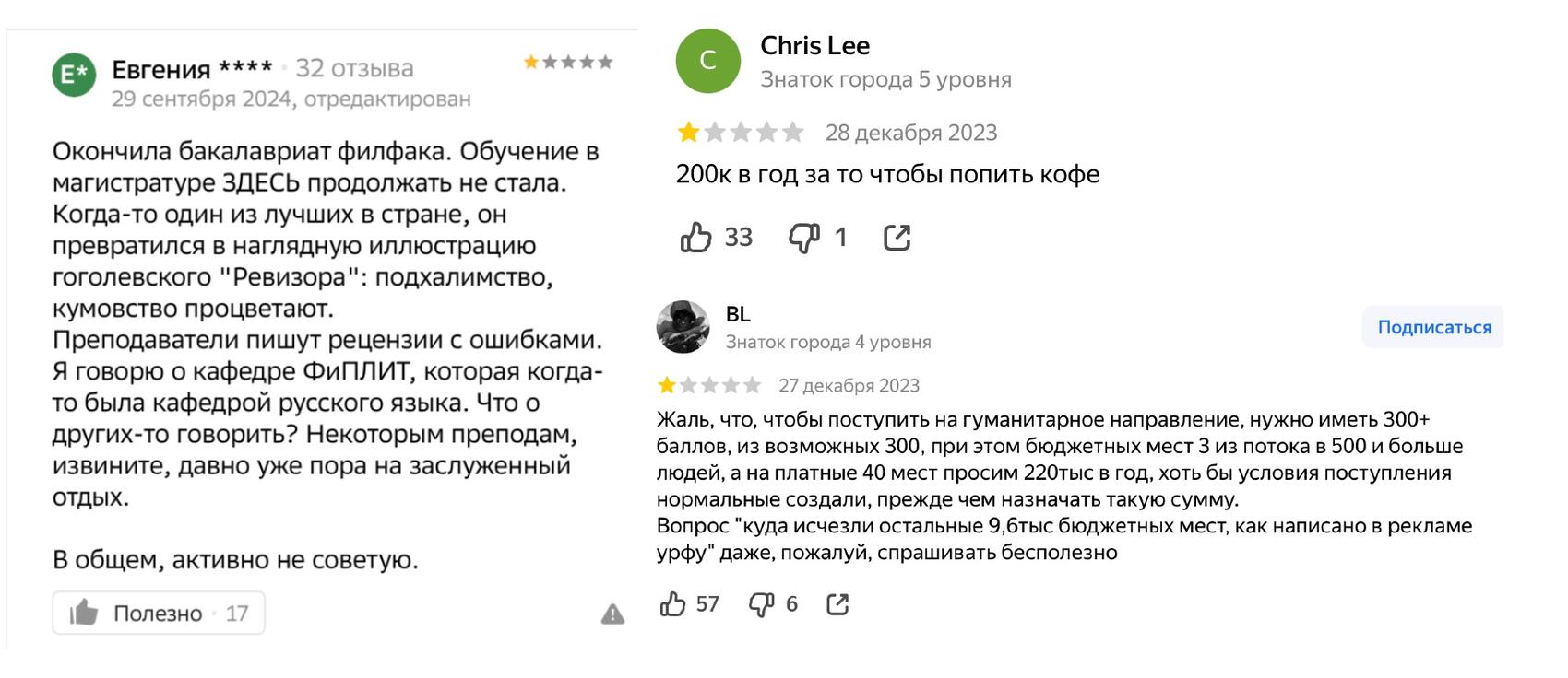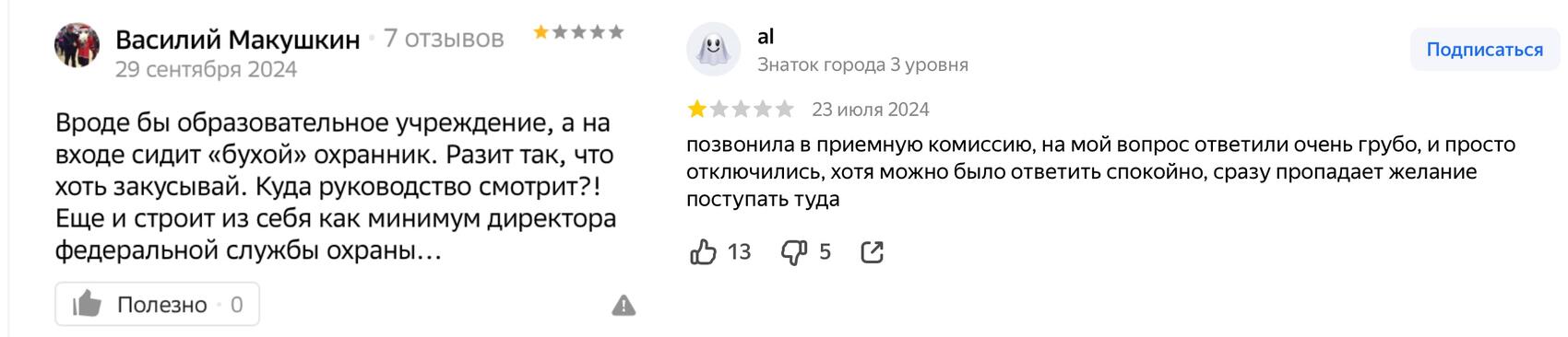 Скриншоты 2Gis и «Яндекс.Карты»К минусам пользователи относят невежливых (и даже пьяных) охранников, которые не пускают студентов без пропуска, кумовство, плохое взаимодействие с абитуриентами в приемной комиссии, а также дорогое и при этом поверхностное обучение, в особенности на гуманитарных специальностях.