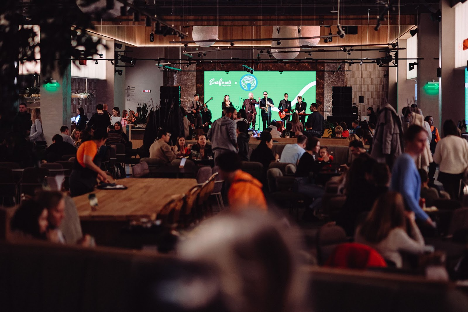 Весь первый этаж поделен на мини-локации со своими названиями. Первая — «Культур-мультур», где находится сцена и проводятся все основные события и кинопоказы. «На деловом» — это coffee point, который открывается с 8:30 утра. Здесь можно купить не только кофе, но и десерты. Третья зона — это зона завтраков, где можно комфортно поработать в течение всего дня. Музыка здесь играет не так громко, как в остальных частях зала, а у каждого стола есть розетка.