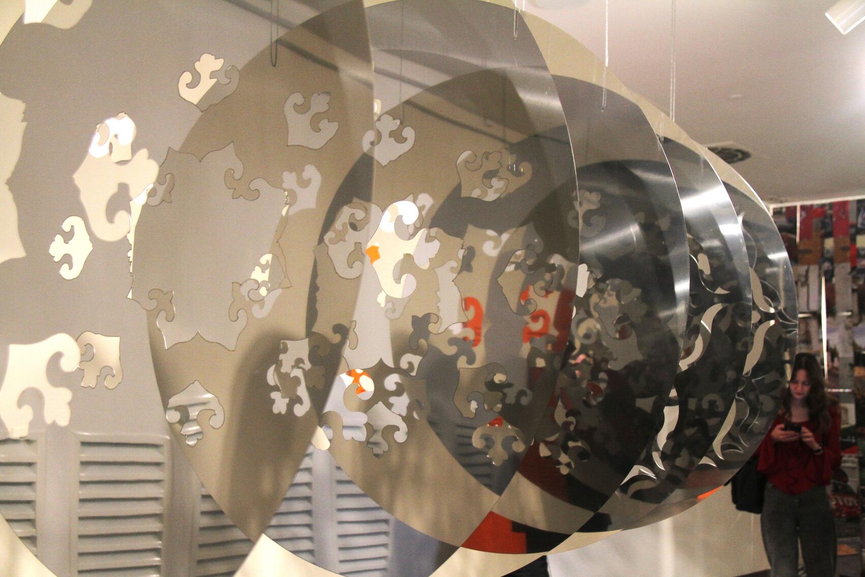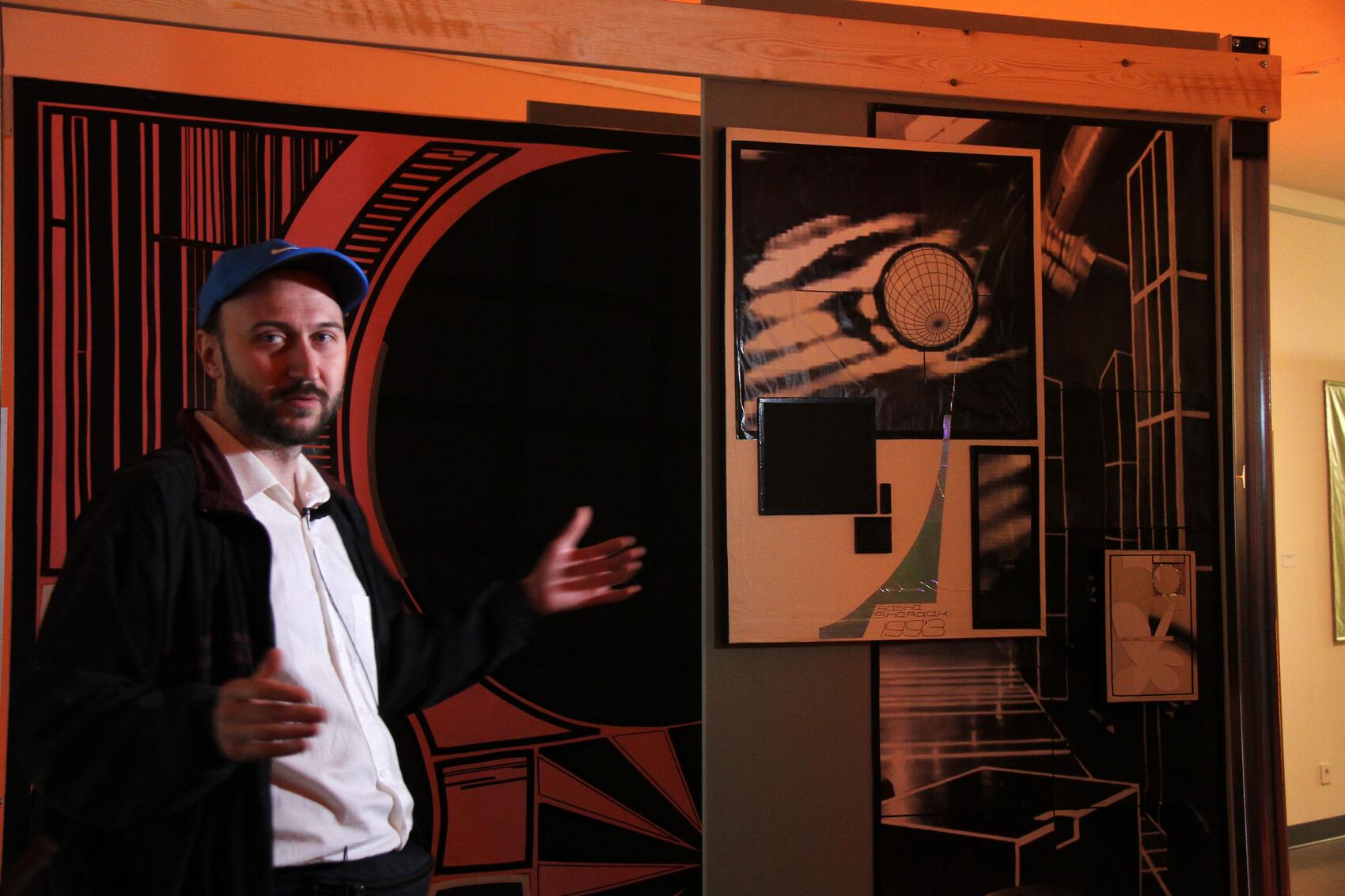 — Экспозиция построена на теме культурной трансформации на переходе веков — из XX в XXI. Работы имеют чисто символический характер, само пространство представлено в виде знаков — элементов дизайна, которые я счел наиболее выразительными для того периода, — рассказывает Саша.