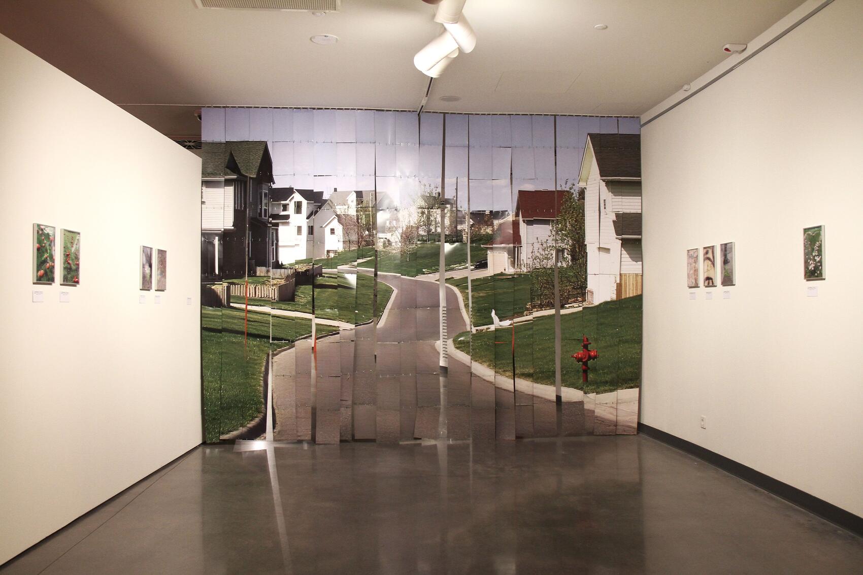 Центральная работа художницы — огромное изображение улицы с коттеджами и идеальным газонами. Полотно разделено на лоскуты и походит на дверные шторы, которые были популярны в странах СНГ в девяностые и нулевые. Оно как раз-таки создано с помощью искусственного интеллекта.