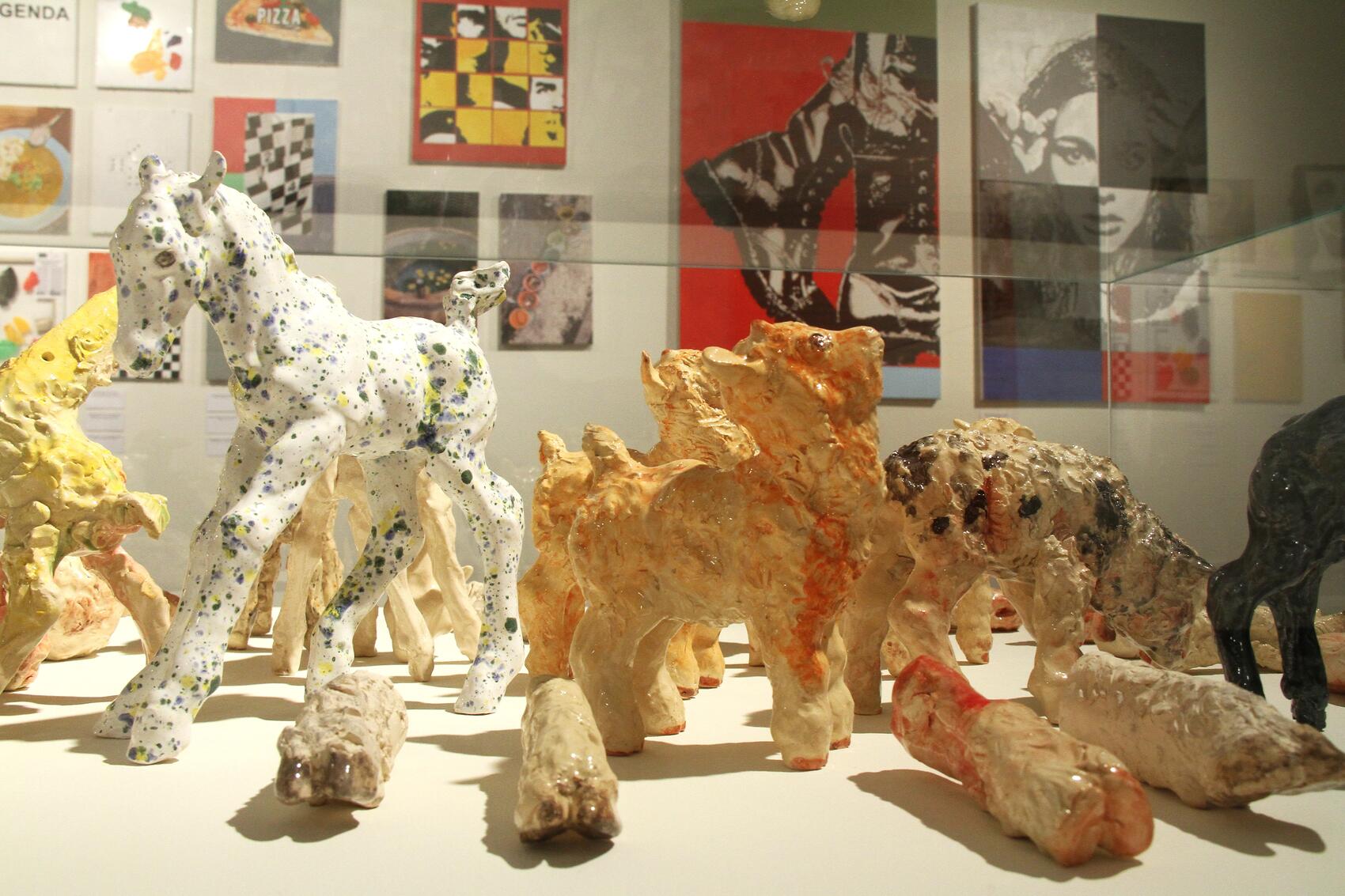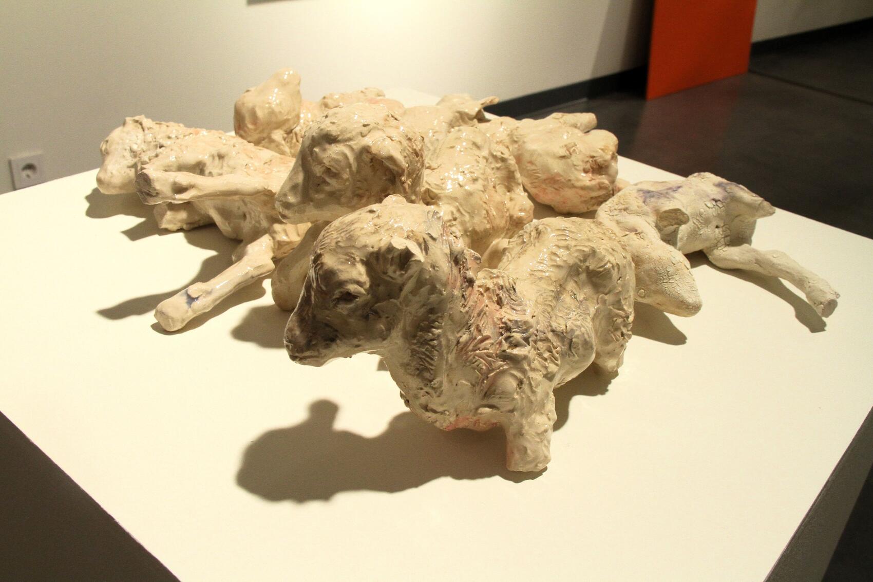 Художница Надежда Ригова привезла в Екатеринбург десятки керамических ягнят и козлят, многие из которых будто доехали не целиком: некоторые из них без голов или ног, зачастую на витринах оказались только лишь ноги и копыта.