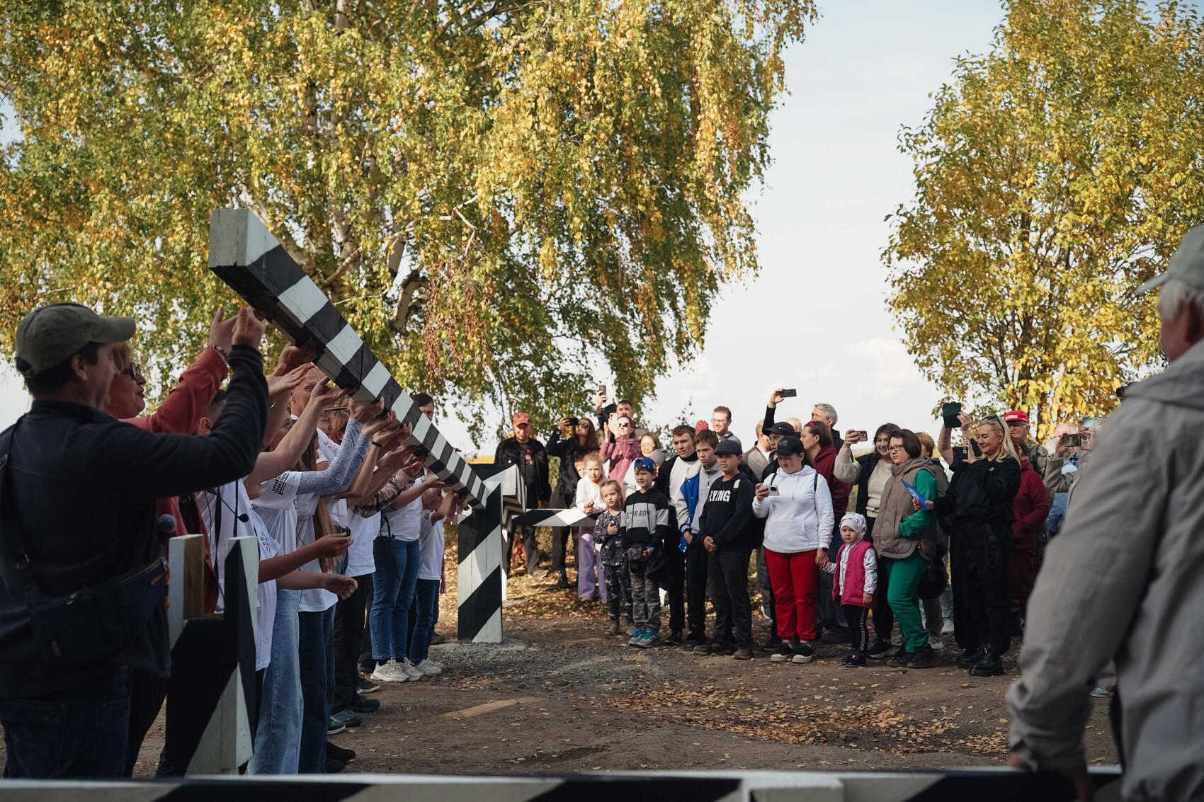 Анастасия Фрикке, основательница проекта «Киргишанская верста»После завершения речи все присутствующие волонтеры, участвующие в создании версты, выстроились у шлагбаума и по команде подняли горизонтальную стрелу. На этом торжественное открытие закончилось, и Фрикке объявила пятнадцатиминутный перерыв, после которого была намечена экскурсия по версте. Мы не стали дожидаться начала и в компании волонтерки Юлии решили пройти версту самостоятельно.
