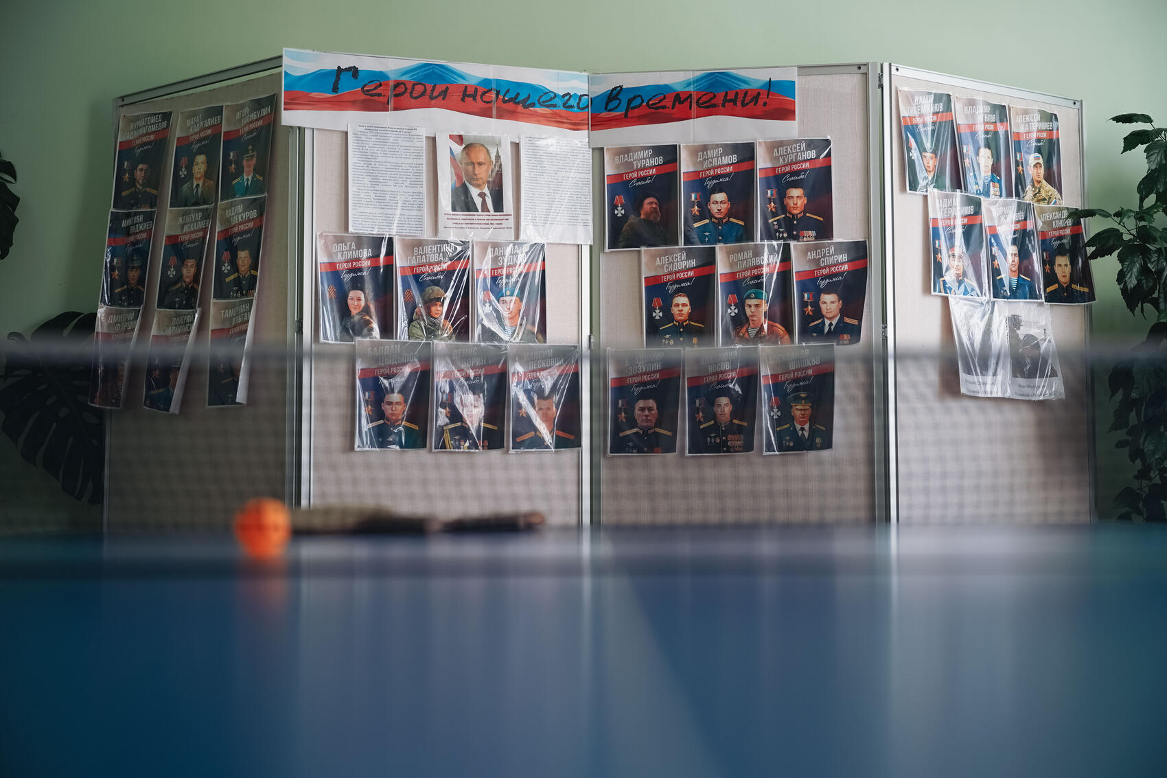 Диана Владимировна ведет нас по двум залам клуба. В первом значительную часть помещения занимает зеленый стол для настольного тенниса с натянутой сеткой. За ним у стены стоят четыре стенда. На центральном под подписью «Герои нашего времени» прикреплена фотография Владимира Путина, ниже и на соседних стендах разместили портреты военных —участников «СВО». На крайнем правом стенде ниже рядов прикреплены две черно-белые фотографии, распечатанные на принтере, на которых изображены мужчины в форме.