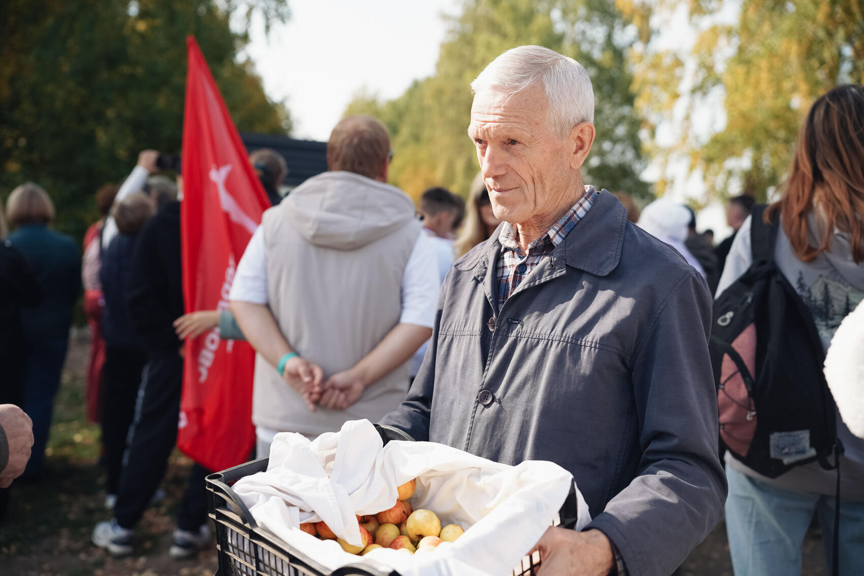 В толпе мелькали белые футболки волонтеров общества «Московско-Сибирского тракта», черная полувоенная форма представительниц «Русского географического общества», камуфляж военно-патриотического клуба «Росомаха» из Большого Истока. Среди собравшихся ходил пожилой житель Киргишан и раздавал желающим выращенные в его саду яблоки.