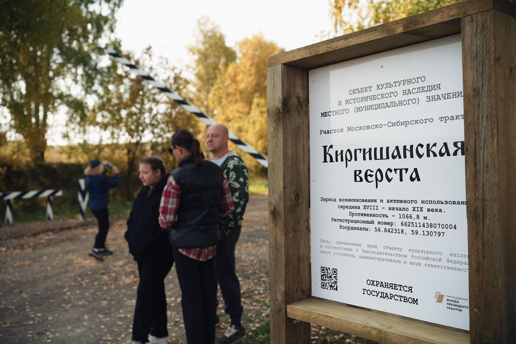 Конец версты обозначен деревянными воротами с навесом. Установка ворот и шлагбаума на противоположных концах версты вызвали тревогу у местных жителей, говорит Юлия. Сельчане использовали этот участок дороги для походов в лес за ягодами и грибами, и установка шлагбаума была воспринята киргишанами как попытка неизвестных людей отжать дорогу. Но волонтерам удалось убедить местных жителей, что верста останется открытой для всех.
