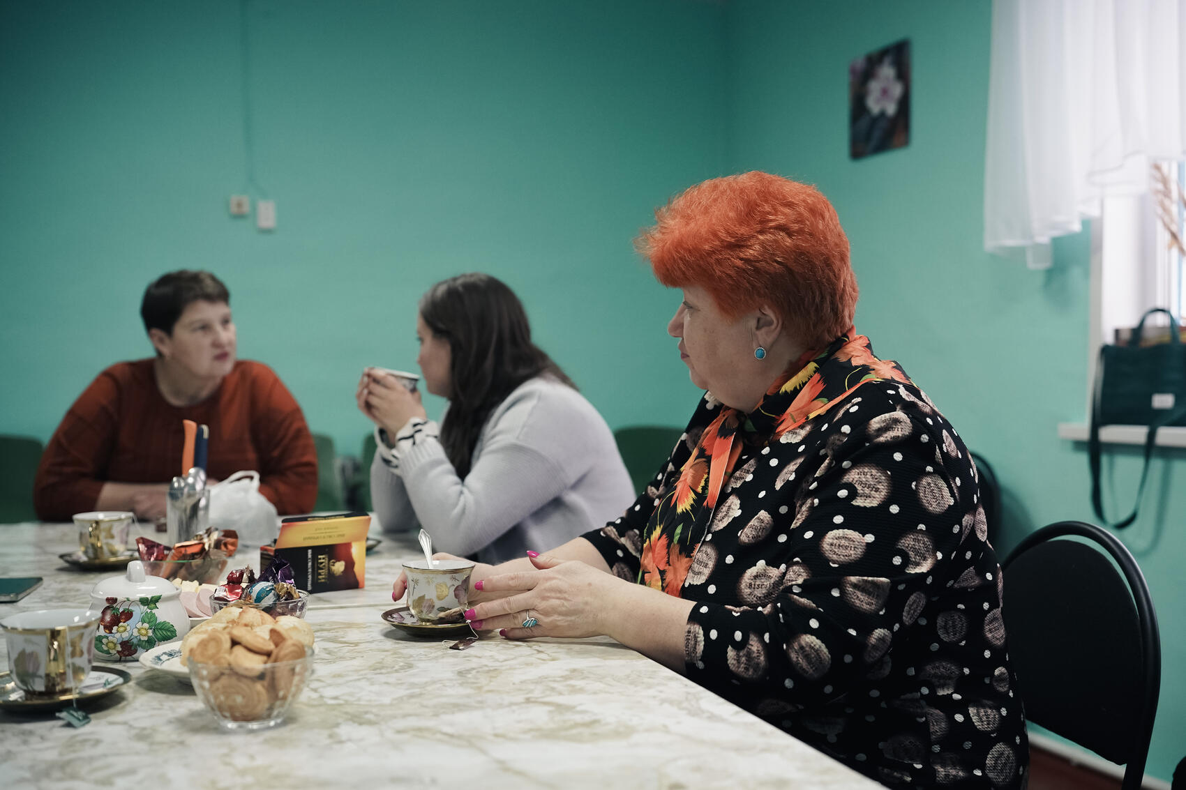 В доме культуры за столом, накрытым к чаю, нас встречают местные активисты: руководительница ДК Тамара Федоровна, учительница начальных классов Юлия Сергеевна и супруги Светлана Михайловна и Вячеслав Александрович Колотовы, переехавшие в деревню из ХМАО.