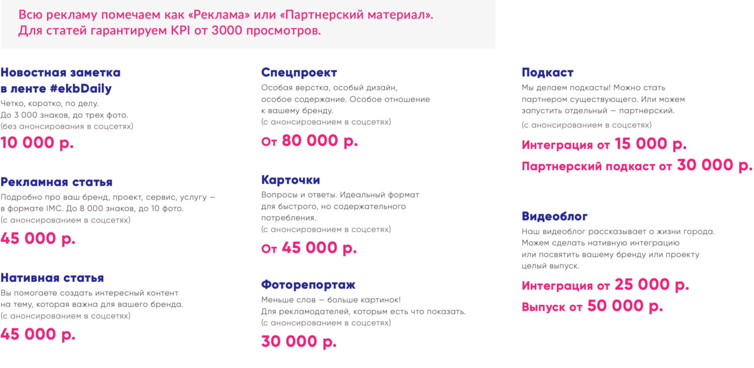 Цены на рекламу очень зависят от сложности исполнения и количества задействованных площадок. У нас есть предложения даже для совсем небольшого бизнеса (например, рекламная заметка на сайте стоит всего 10 000 рублей, а пост в Telegram еще меньше — 3500). А есть предложения для крупных партнеров — масштабные спецпроекты за сотни тысяч.